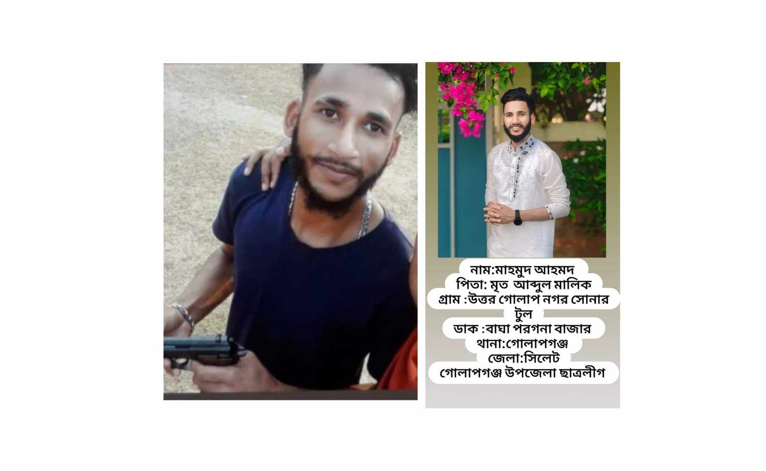 সিলেট জেলার গোলাপগঞ্জ উপজেলার শীর্ষ দুই অস্ত্রধারী মাদক কারবারি মাহমুদ আহমদ (২৩), সদস্য গোলাপগঞ্জ উপজেলা ছাএলীগ, সাং: উওর গোলাপনগর, সোনারটুল